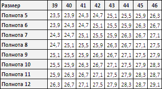 Таблица полноты мужской обуви Sursil-Orto